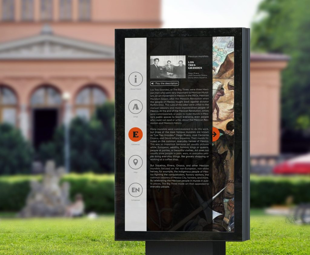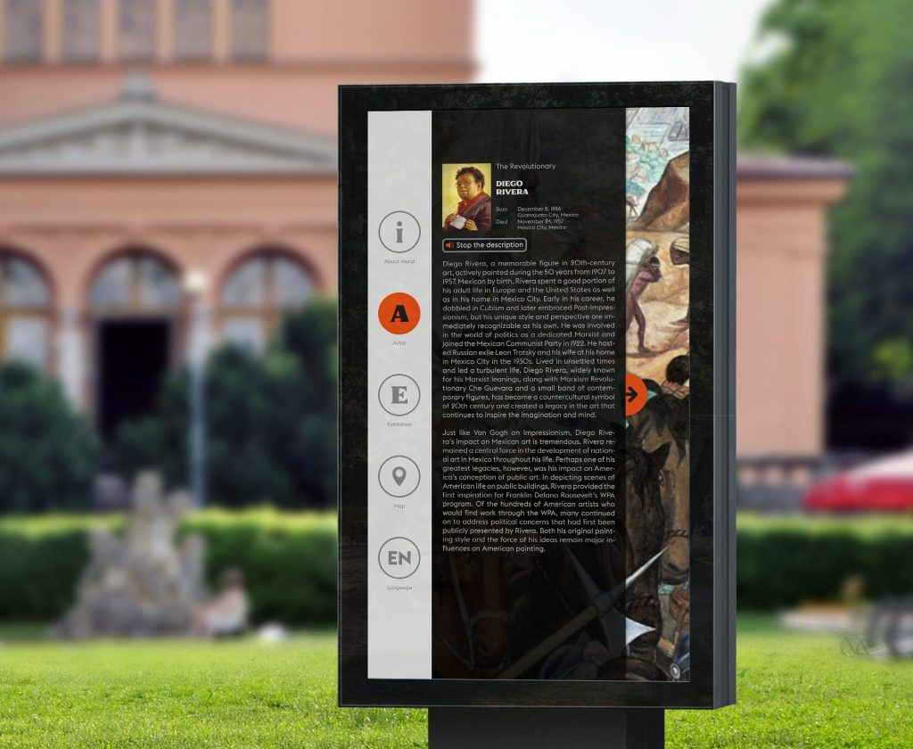 Design students are tasked with creating interactive kiosk screens placed in a prominent city park. The kiosk’s purpose is to inform visitors about Latin American artists and their works. Students are responsible for designing both the interactive interface and curating the content to showcase artists’ backgrounds and contributions. The goal is to provide an engaging, educational experience for park visitors interested in exploring the world of Latin American artistry.